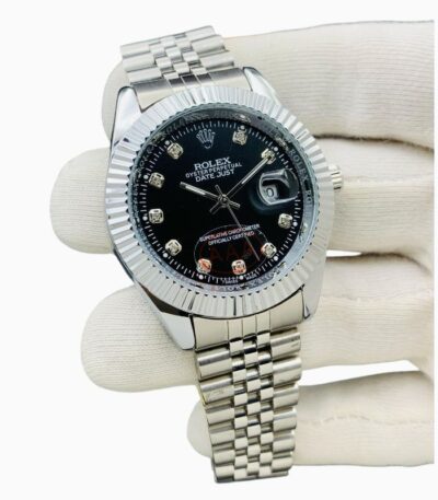 Classic Silver Edition Luxury Men’s Watch – Black Diamond Dial & Fluted Bezel President Link